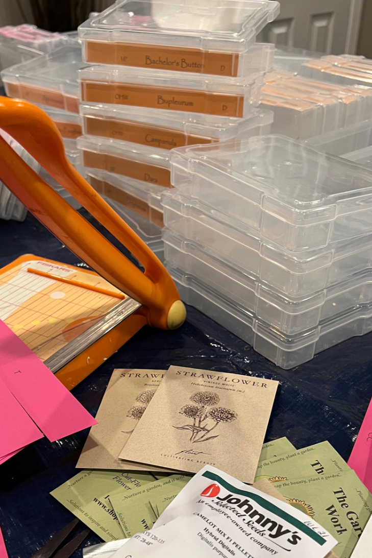 Inside each box, everything is alphabetized with color‑coded labels, so the seasons are easy to recognize. For each container, I jot down the flower name and whether it’s a transplant (T) or direct seed (D). Having a plan, even a simple one, makes life a little easier on the farm.